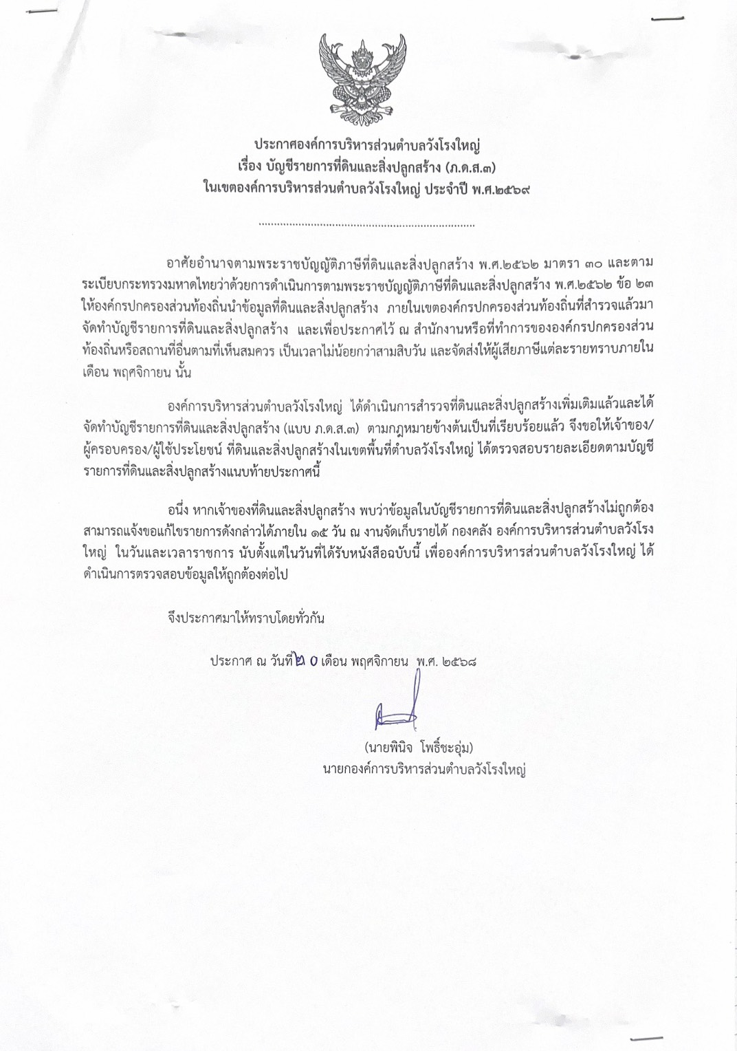องค์การบริหารส่วนตำบลวังโรงใหญ่ ขอแจ้งประชาสัมพันธ์ ประกาศรายการที่ดินและสิ่งปลูกสร้าง 🏨🏘 (ภ.ด.ส.3) ประจำปีงบประมาณ 2569