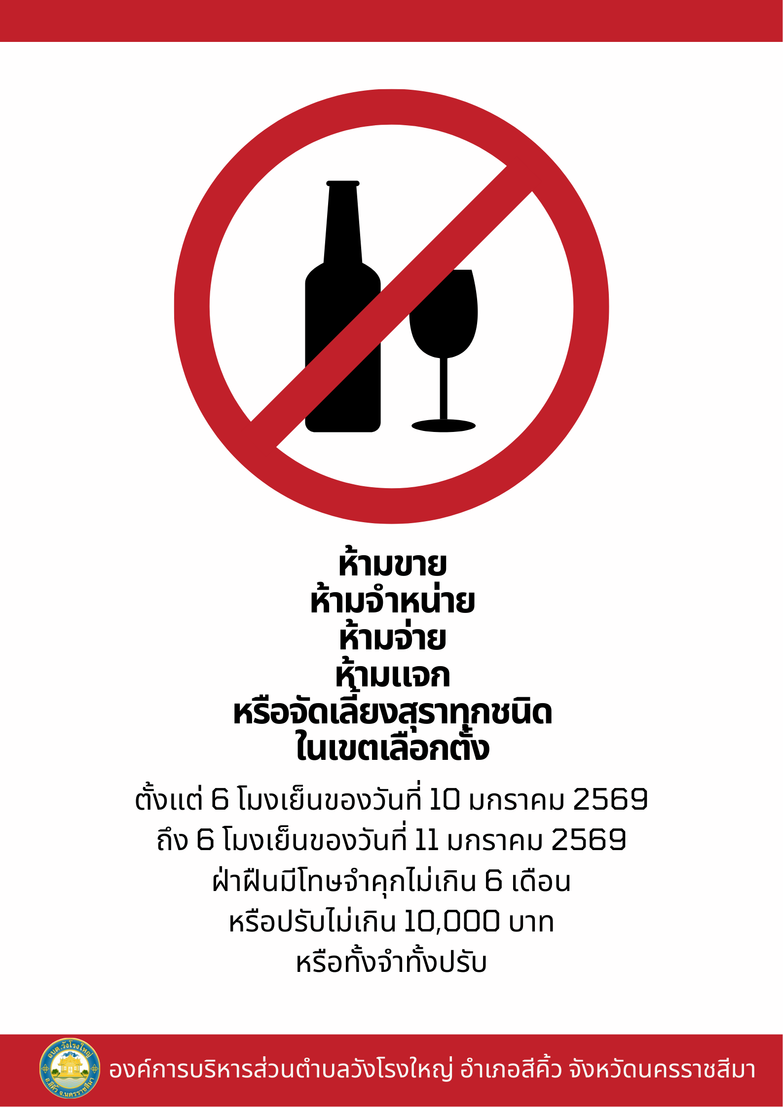 ห้าม!! ขาย จำหน่าย จ่าย แจก หรือจัดเลี้ยงสุราทุกชนิดในเขตเลือกตั้ง ตั้งแต่เวลา 6 โมงเย็นของวันที่ 10 มกราคม 2569 - 6 โมงเย็นของวันที่ 11 มกราคม 2569